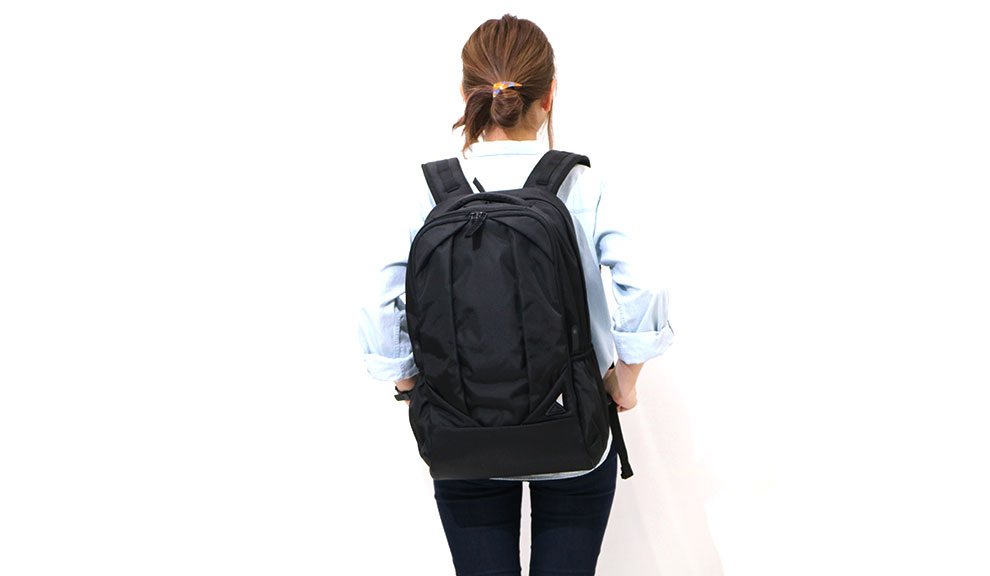 シンプルなルックスで、機能性・収納力も抜群ですが、同程度のスペックの素材と比べて約20%程度軽量な中空ナイロン840dを採用しているため、軽量性にも優れています。また体にフィットするように設計されたハーネスで、長時間の移動にもおすすめです。曲線シルエットなので、女性が背負っても大きく見えづらくとても自然にフィットします。入る分、何かと荷物を入れてしまいがちですが、カバン自体が重くないというのは、嬉しいポイントですね。