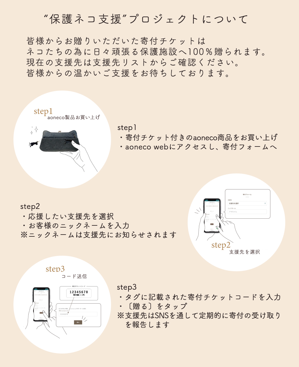 アイテム説明 「全てのネコが隙だらけに眠れますように」という願いを込めたブランド『aoneco』のパスケース。熟練職人が手がける上質な本革を使用した、かわいくなりすぎない“厳かにネコ”なデザインが寄り添います。カードは表裏に2枚収納でき、伸びるリールでバッグに付けたままスムーズに使用可能です。付属のチケットから誰でも簡単に寄付を贈ることができ、商品代金の約10%が保護ネコ施設へ寄付される透明性の高い仕組みがポイント。猫と人の幸せな未来を支援する、新しい形のプロジェクトです。