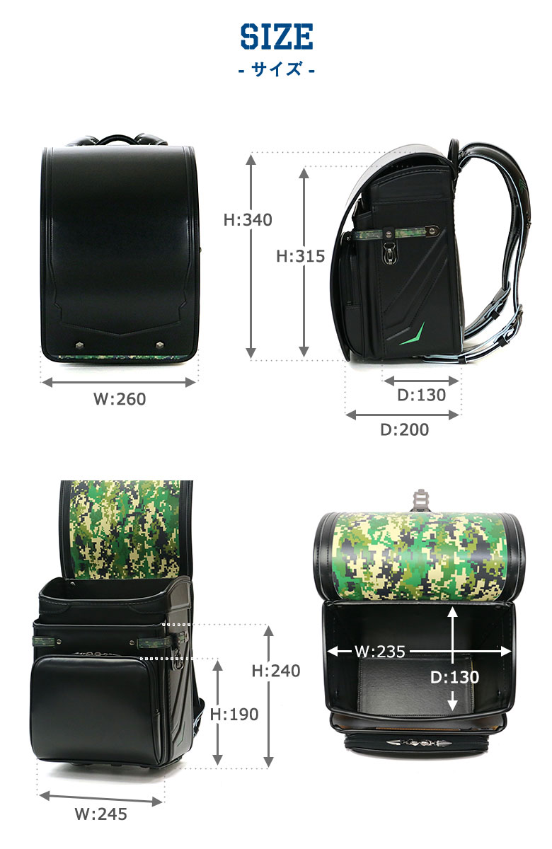 アイテム説明 コンピューター生成によるドットで構成され、2002年にカナダ軍が戦闘服に採用したデジタルカモフラージュパターンの代名詞である『CADPAT』を、ギャレリアのオリジナルデザインで『GADPAT(GALLERIA Disruptive Pattern)』として再現しました。カナダ軍の開発時に大変高い評価を受け、アメリカ軍もこれを参考にして独自のデジカモを開発したほど大きな影響を与えた存在感のあるグラフィックパターンを、冠(カブセ)裏や前締めベルト、反射材などに採用した、今までに無かった新しいデザインのランドセルです。冠(カブセ)表側にはクラシカルな雰囲気のエンブレム(紋章)の形をステッチワークで表現。森や砂漠、市街地など、どんな環境にも溶け込むようデザインされ、そのステルス効果で身を守るために開発されたカモフラージュパターンを採用することで、「新しい環境にも溶け込めて、様々な危険から子供たちを守ってくれるように」との思いを込めました。シャープでスタイリッシュなデザインのランドセル。6年間のスクールライフを楽しくカッコよく彩ります。六角形のヘキサゴンスタッズがミリタリー感を引き立て、ハードながら上品なイメージに。背負いベルトの中央には軍での階級を示す徽章(きしょう)をモチーフにしたデザインのリフレクター(反射材)を採用。両側の側面に配置したV型のアイコンは戦闘機のフォルムをイメージ。それぞれのデジカモの色彩に合わせて、Woodland GreenとMarine Blueでカラーリングしました。