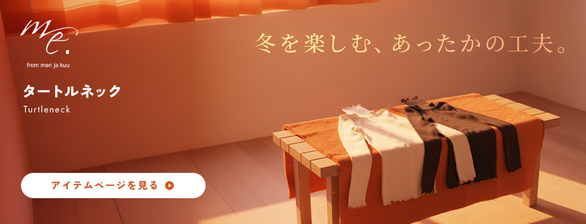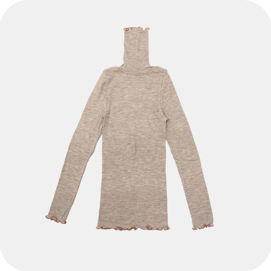 肌触りが良く、快適な着心地が魅力のウール100%のタートルネック。本体は保湿性と放湿性も持ち合わせているため、冬は温かく、夏は涼しく、シーズンレスで着用いただけます。また汗で蒸れたりひんやりとした感触などのストレスを感じにくい仕様もポイント。首元や袖先、ウエスト部分に施されたメローがアクセントになった細部のデザインにも注目です。