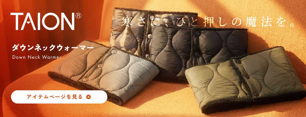 ヘチマキルトのダウンステッチでミリタリーテイストを加えた『MILITARY LINE』シリーズのリバーシブル仕様ネックウォーマー。保温性の高い800FPの上質ダウンを表地に採用し、裏側にはボア素材を使用することで暖かさをプラス。シンプルなデザインで、幅広いコーディネートに合わせやすいのも嬉しいポイント。フロントには、TAION刻印のYKK金属スナップボタンを使用し着脱も簡単。同シリーズのダウンベストやダウンジャケットと合わせていただくのもおすすめ!プレゼントにもぴったりな冬場の寒い時期に欠かせないアイテムとなっています。